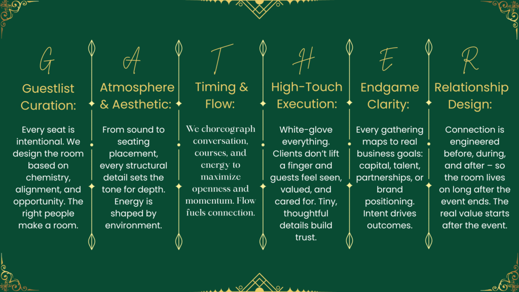 The room is the strategy. We map guest relationships and build seating that creates the right conversations before anyone sits down.