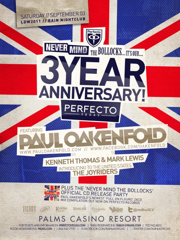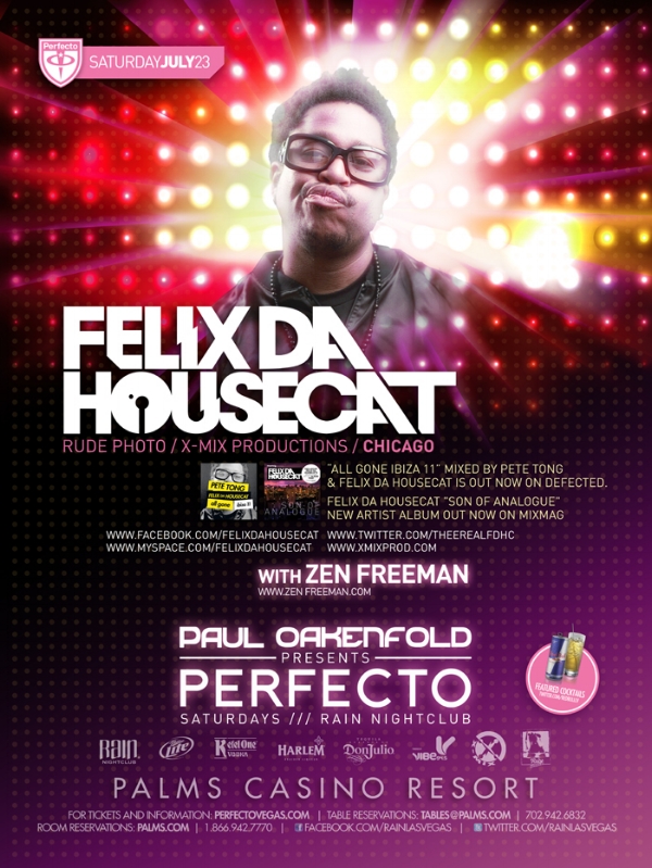 Perfecto opened in the fall of 2008 to host Paul Oakenfold's first US residency at the Palms Hotel. Conceptualized specifically for the Rain Nightclub, a 25,000 square foot multi-level venue known for its special effects and international headliners, the show was an interactive electric dance music experience with dancers, characters, acrobats and aerialists at every turn. Perfecto ran for three years, and forever changed the format of music and entertainment in Las Vegas nightclubs.